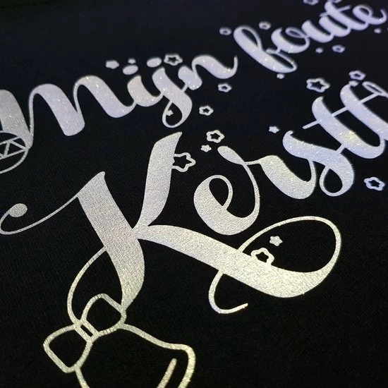 De hoodie ziet er feestelijk uit doordat de opdruk met zilver/glitter is gedrukt.