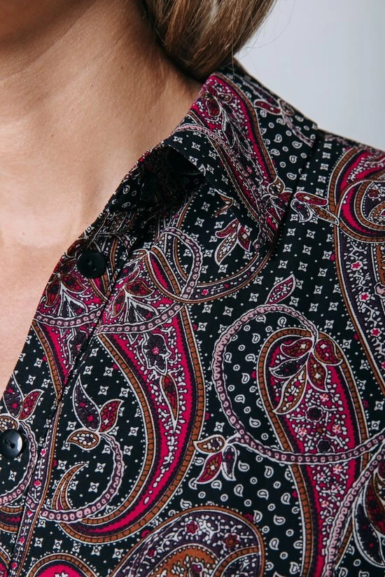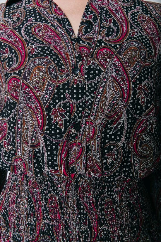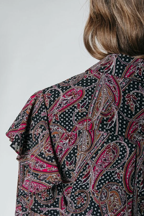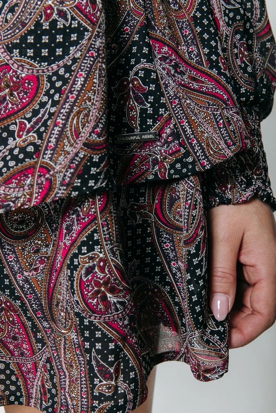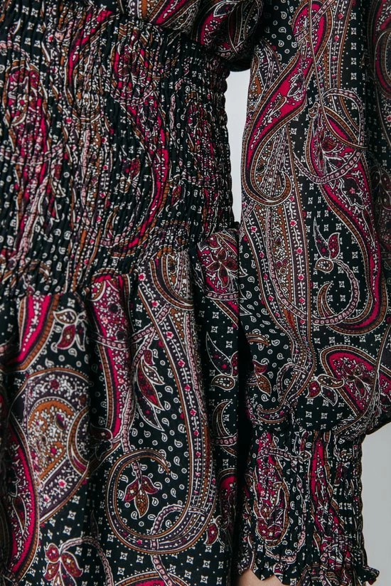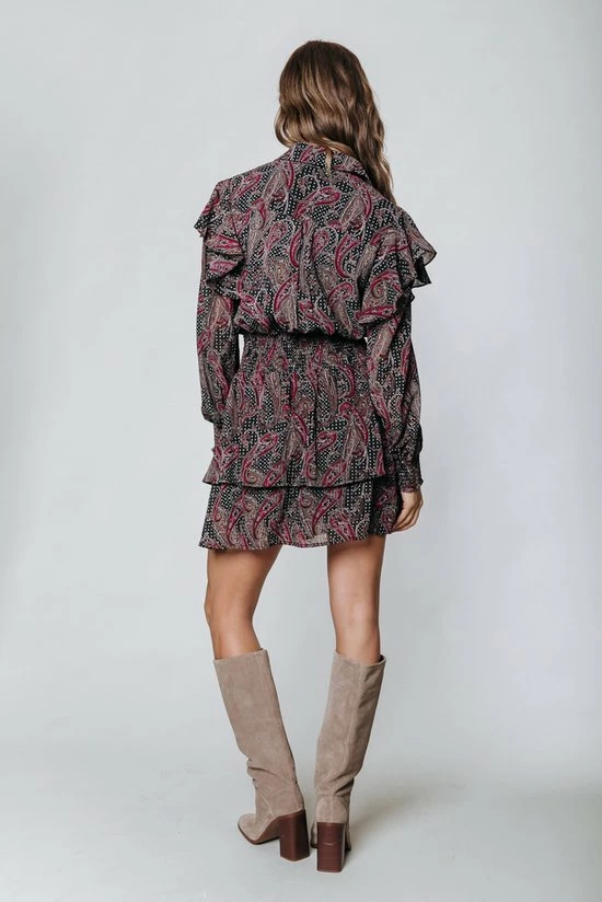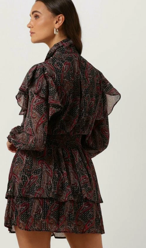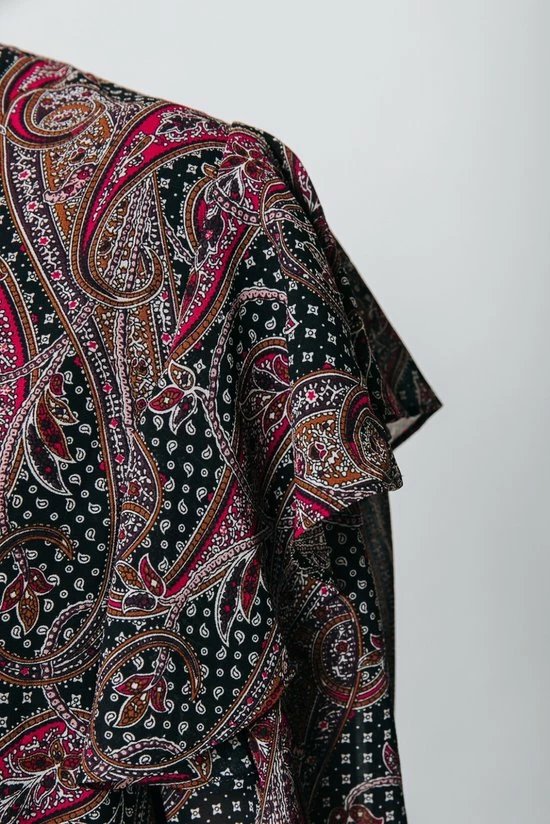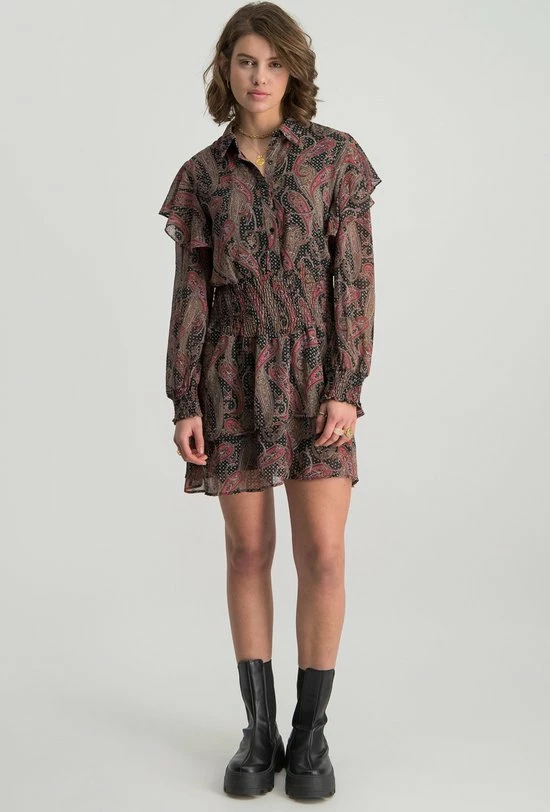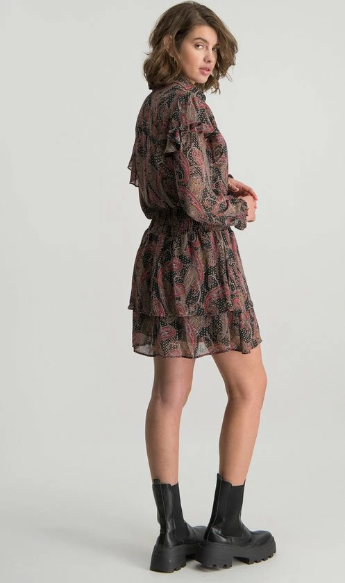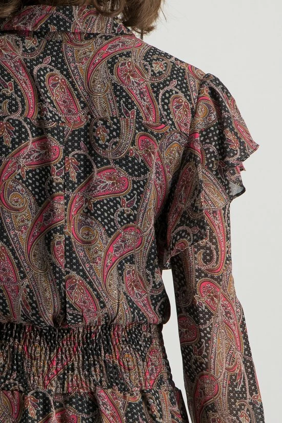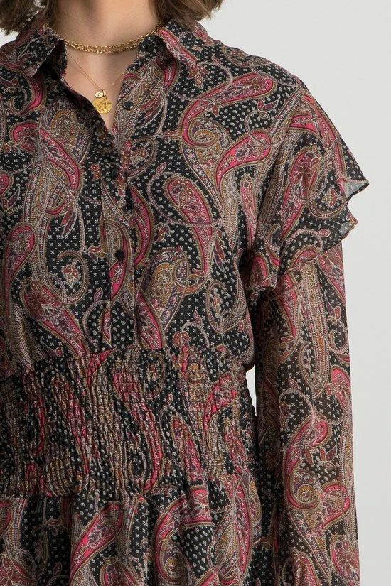 Ruffle jurkBasic fitKorte lengteLange mouwKnoopsluitingPaisley dessin100% polyester, ChiffonNon stretch stofAlleen handwasModel is 1.70m en draagt S