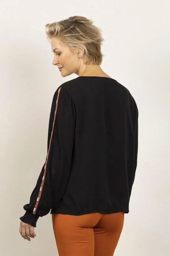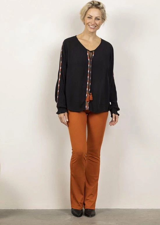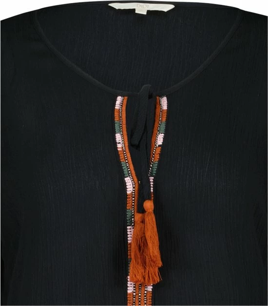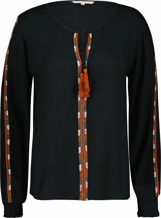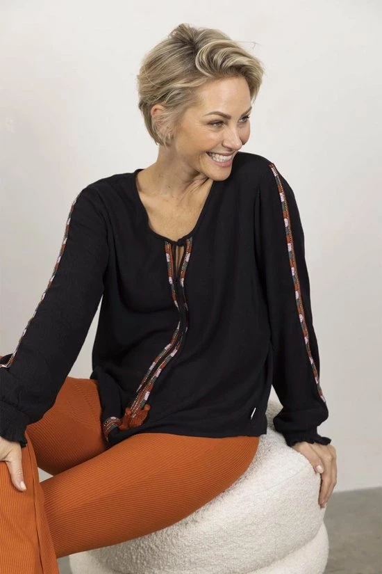 Blouse met een geborduurde bies aan de voorzijde. De hals van de top is afgezet met een koordje met een kwastje. Ook heeft de mouw een geborduurde bies, en heeft een elastische boord. Gemaakt van Rayon.