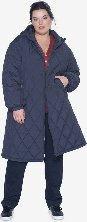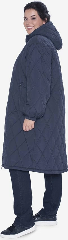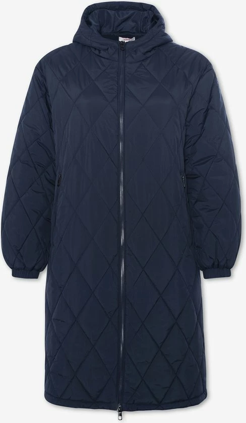 Lange winterjas, a-lijn model voor dames. De pufferjas heeft een capuchon en steekzakken met rits. De sluiting van de jas is een dubbele rits. De kraag is opstaand voor extra warmte. Met quilted patroon.