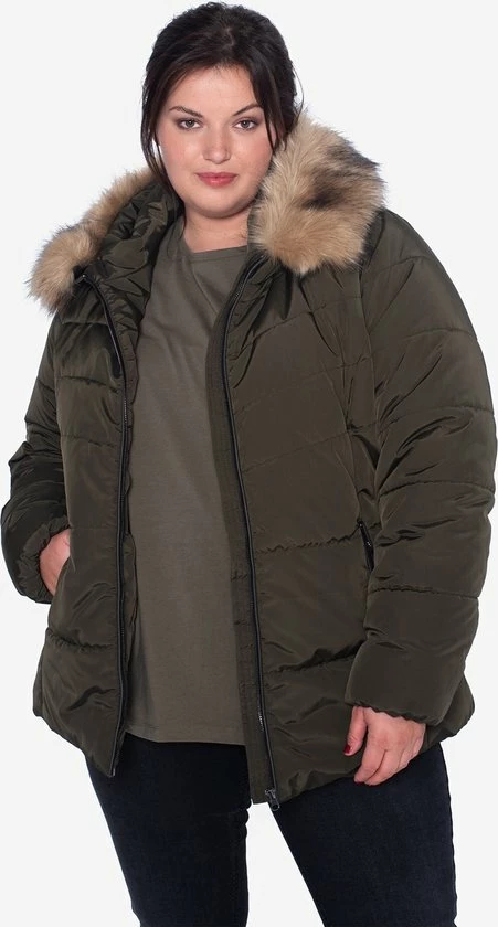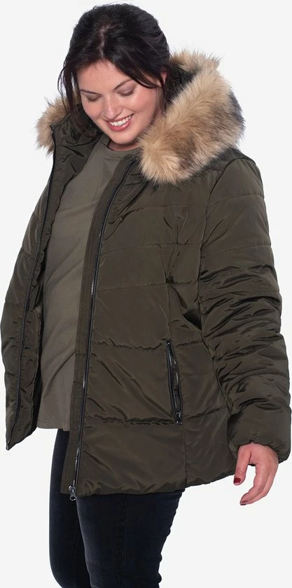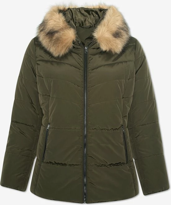 Winterse donsjas met kap. De kap heeft een afneembare faux fur rand en een padded body. De jas sluit vooraan met een rits en heeft zakken. De jas heeft een khaki groene kleur die makkelijk te combineren is.