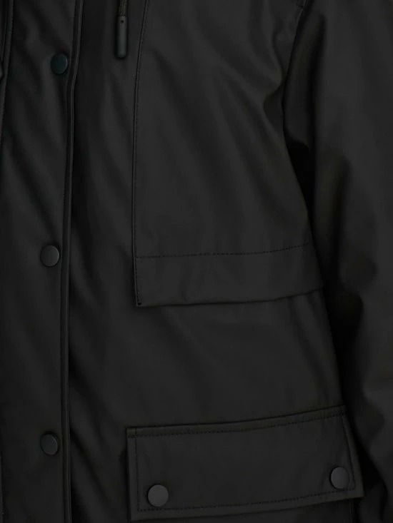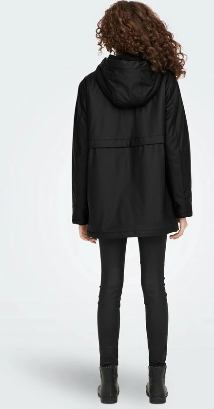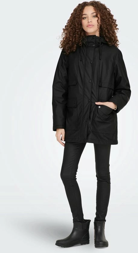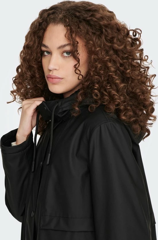 Regenjas van JDY met lange mouwen en een vaste capuchon. De jas heeft klepzakken met drukknoopsluiting en sluit met een knoop – rits combinatie.