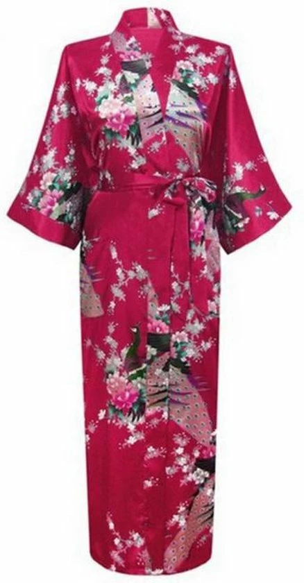 • Donkerrode geisha kimono met Japanse print met bloesem en pauwen,