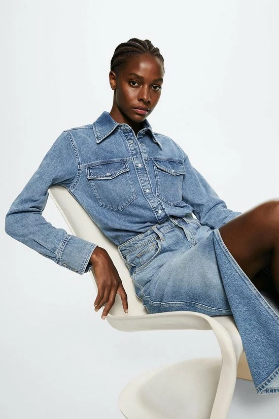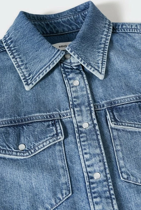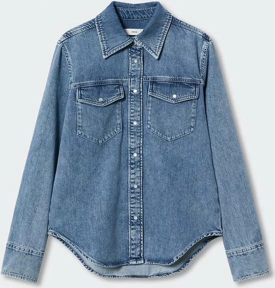 Stoere denim blouse van Mango met lange mouwen en een puntkraag. Deze blouse heeft klepzakken met drukknoopsluiting op borsthoogte en een subtiele bleached wassing. daarnaast sluit deze duurzaam geproduceerde blouse met parelmoeren drukknopen.