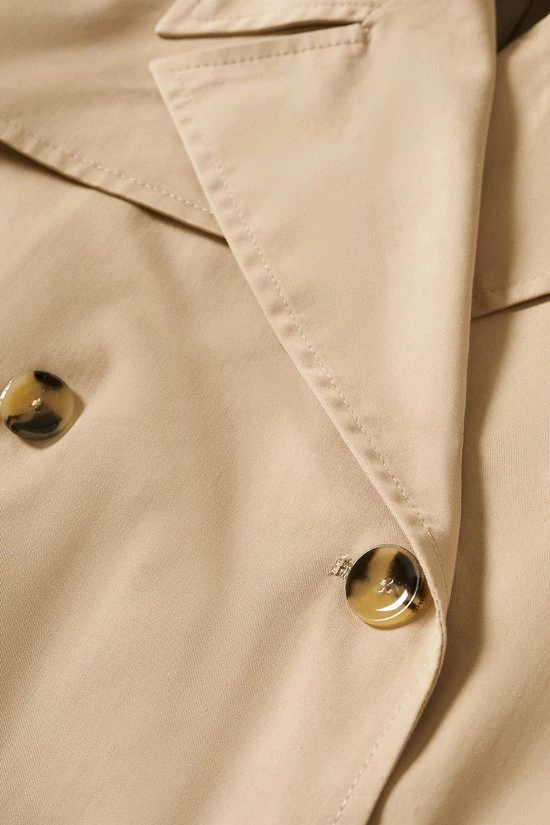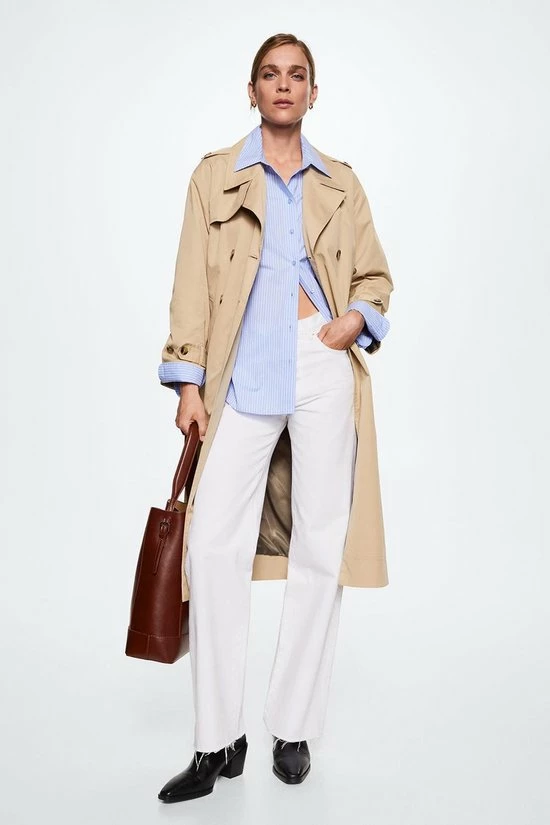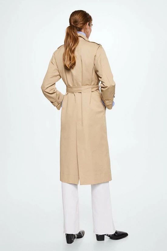 Lange trenchcoat van Mango. Dit model heeft een reverskraag. De lange mouwen zijn voorzien van een bandje met een knoop aan de onderkant. De jas sluit met een dubbele rij knopen en heeft een ceintuur rond de taille. Aan de voorkant zijn twee steekzakken geplaatst.