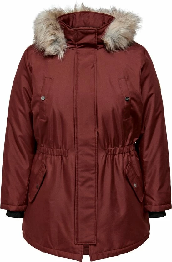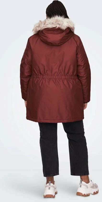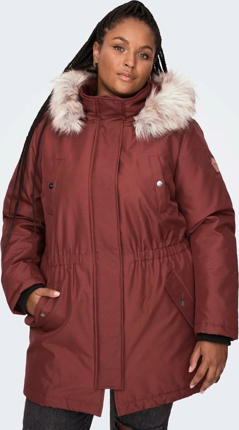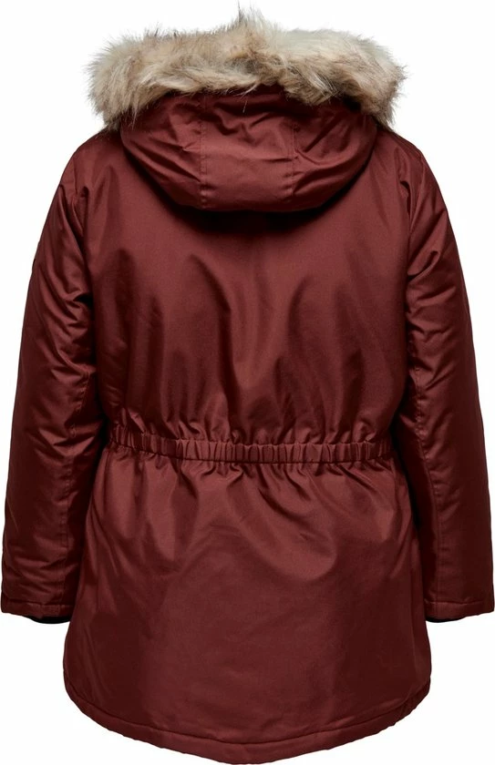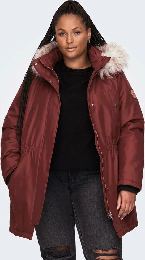 Mooie Bordeaux rode parkajas uitgevoerd met taillekoord om de middel, 2 borstzakken met drukknop, 2 zijzakken met afsluitklep, verborgen rits en muts met afneembare bontrand van het merk Only Carmakoma.