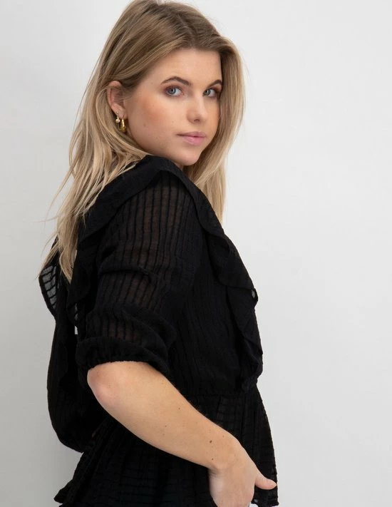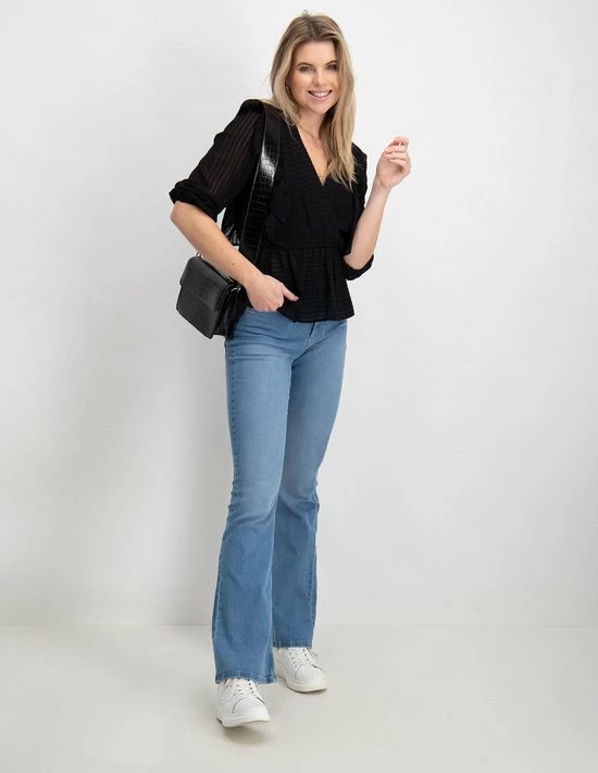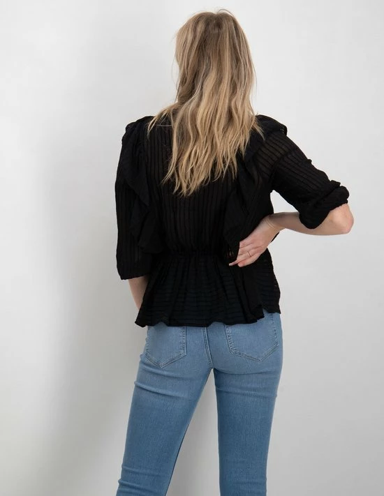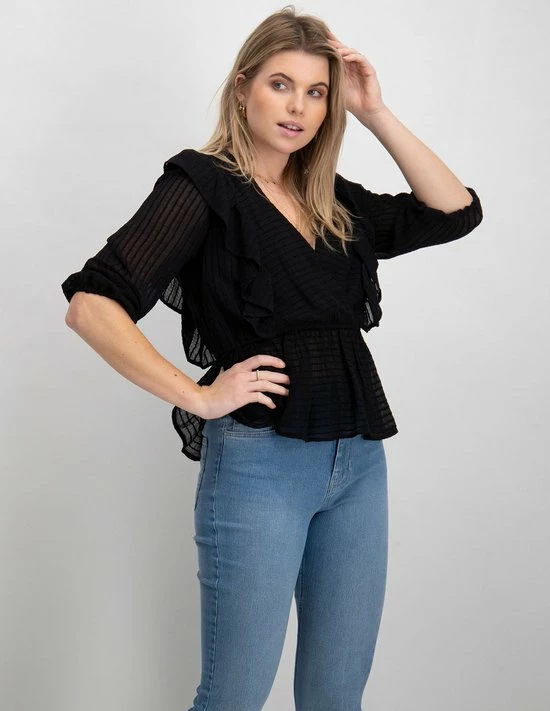 – Type stijl : Top- Mouw lengte : 3/4 mouwen- Mouw type : Volumineuze mouwen- Neklijn / kraag : V-Hals- Extra details : Ruches voor elegante rand
