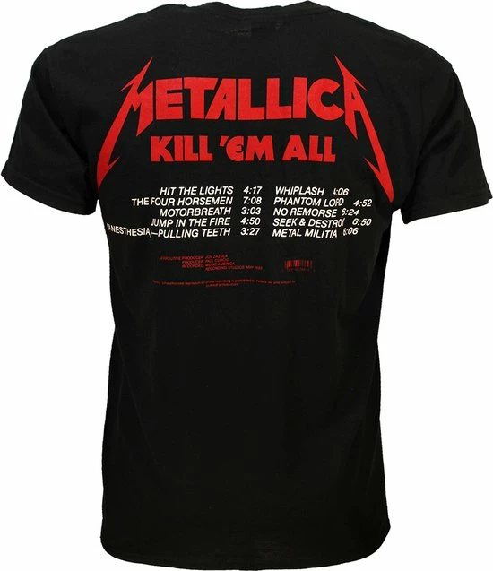 Een officieel gelicentieerde zwart Metallica Unisex T-shirt met als print het bekende Kill Em All album cover design. Dit hoge kwaliteit T-Shirt heeft ook een back print. Op de rug staan namelijk de tracks die op het album staan.