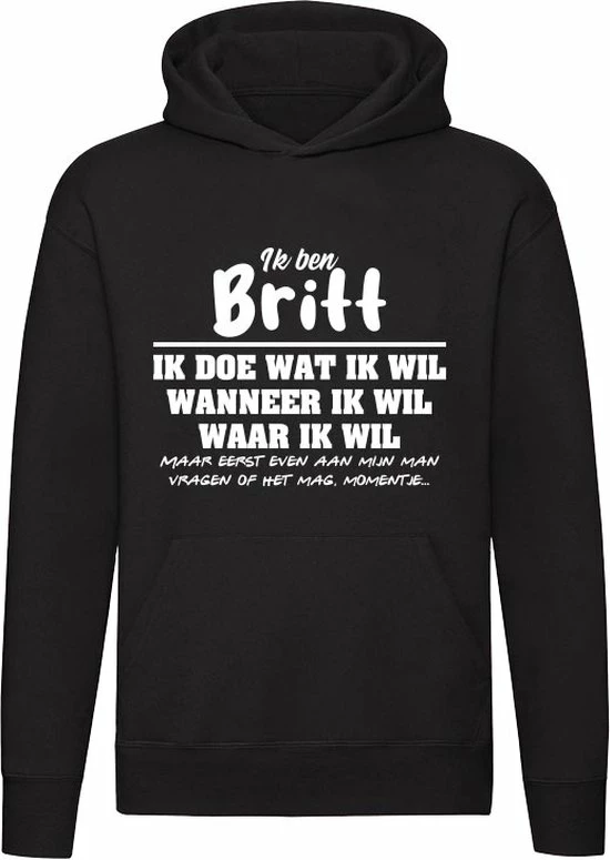 Zwarte hoodie met capuchon en witte opdruk voor Britt. Ik doe wat ik wil, wanneer ik wil, waar ik wil. Erg grappig. Ook leuk als cadeau!