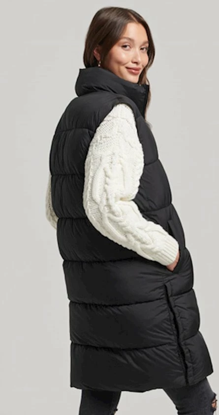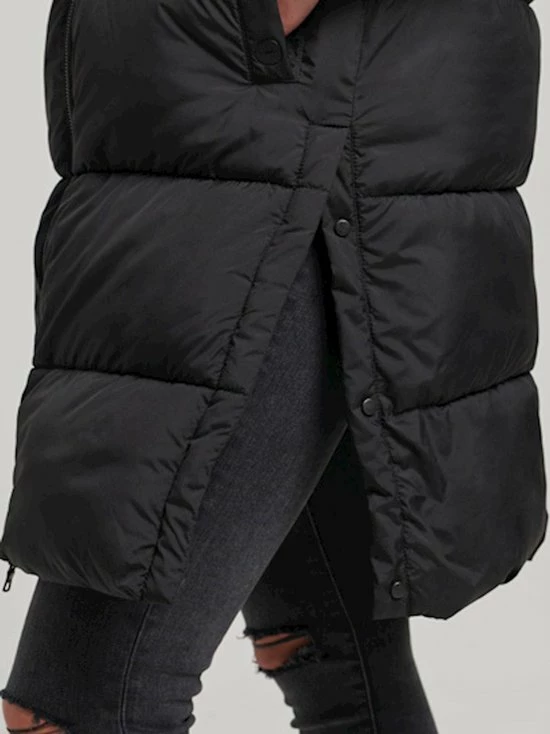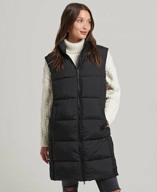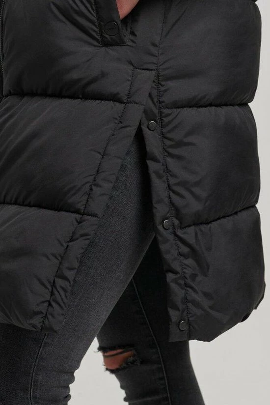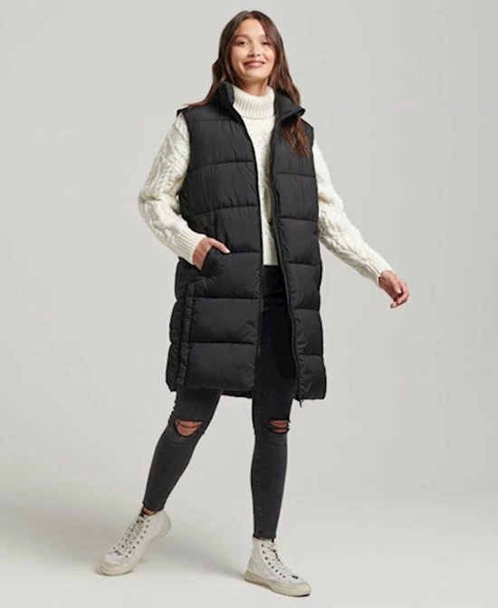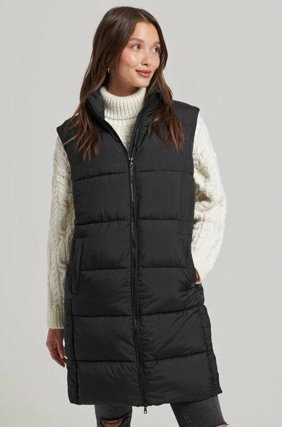 Gewatteerde bodywarmer van Superdry met doorgestikte naden. De jas heeft een highneckkraag en sluit met een rits. Aan de voorkant zijn twee steekzakken geplaatst die sluiten met een drukknoop. Deze halflange bodywarmer heeft drukknopen aan de zijkant om meer bewegingsruimte te creeeren.