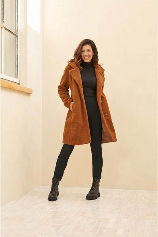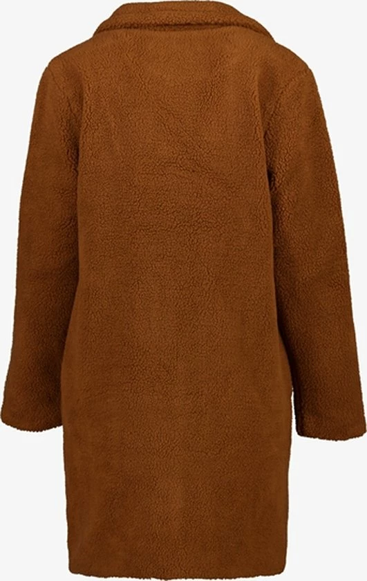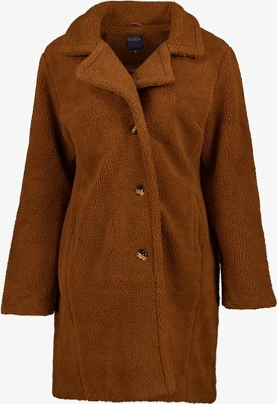 Donkerbruine teddy coat voor dames. Voorzien van een reverskraag en drie knoopsluitingen. De teddy jas heeft twee steekzakken en is gemaakt van 100% polyester