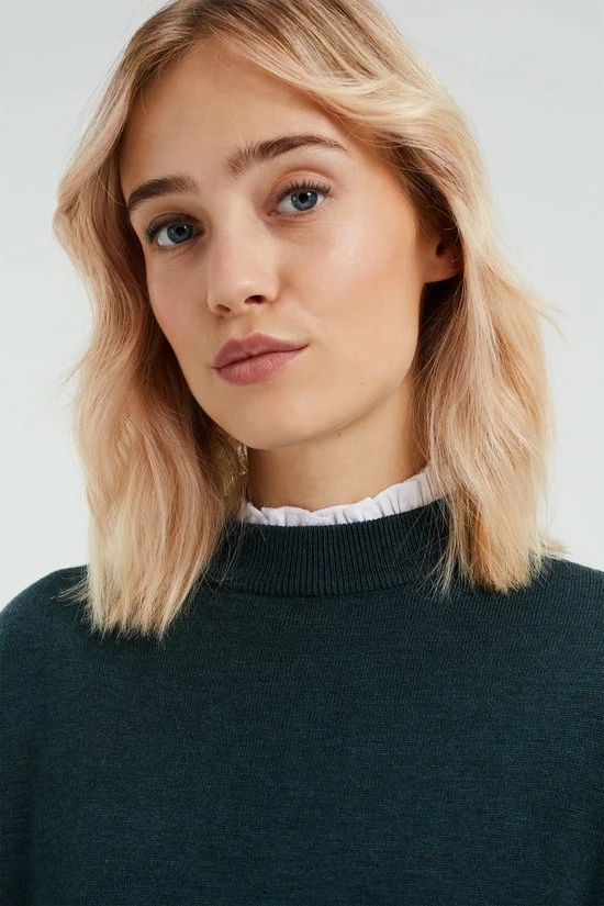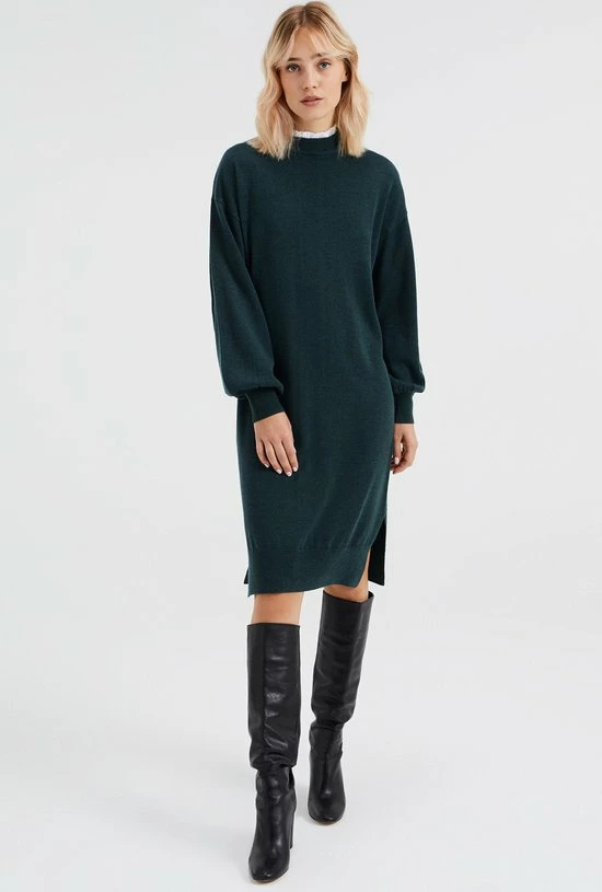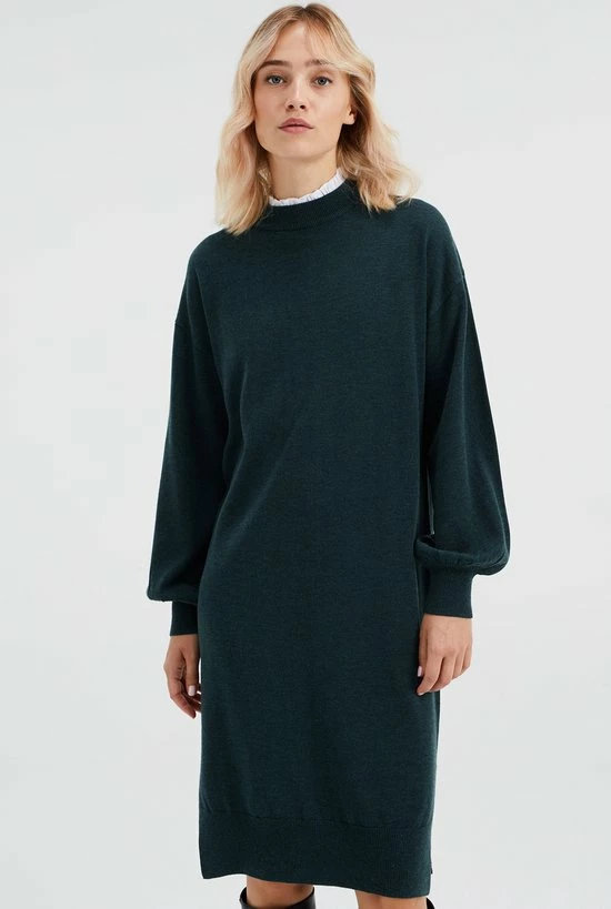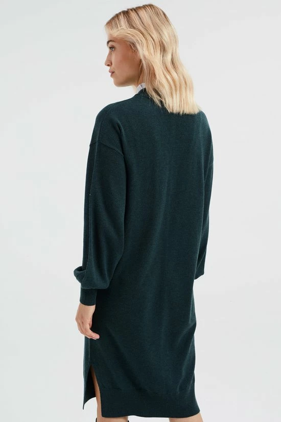 Een regular fit jurk van fijngebreide kwaliteit met ribstof aan de onderkant, een ronde hals, ballonmouwen en twee zijsplitten. Het model valt over de knie.