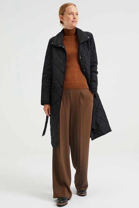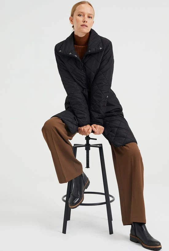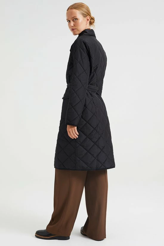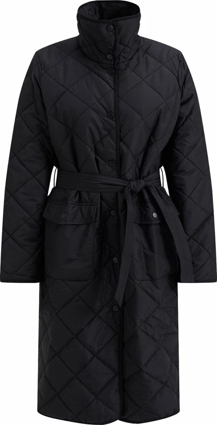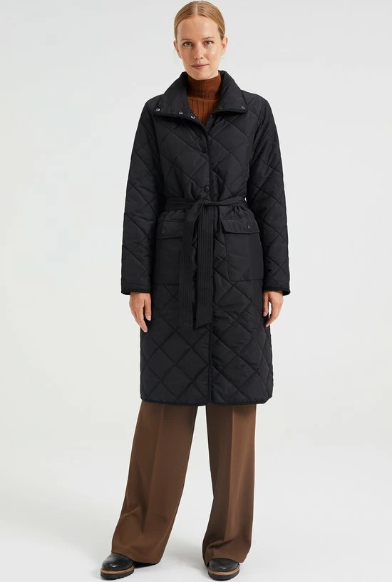 Een regular fit jas van geweven kwaliteit met een gestikt dessin, een drukknoopsluiting en een afneembaar strikceintuur. Het licht gewatteerde model heeft twee paspelzakken met een drukknoopsluiting, een normale hals en lange mouwen.