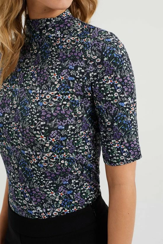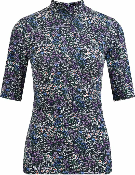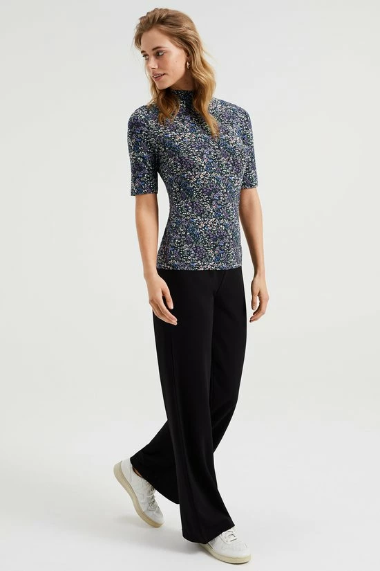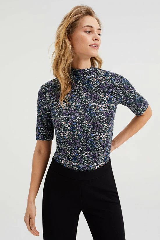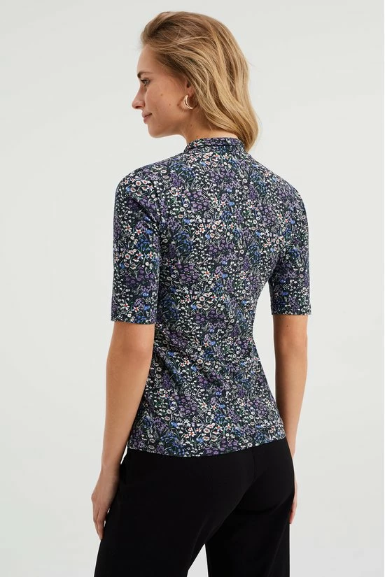 Een nauwsluitend T-shirt van katoen en modal kwaliteit met toegevoegde stretch en een bloemendessin. Het model heeft een opstaande boord en korte mouwen.