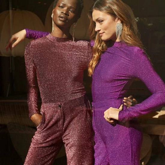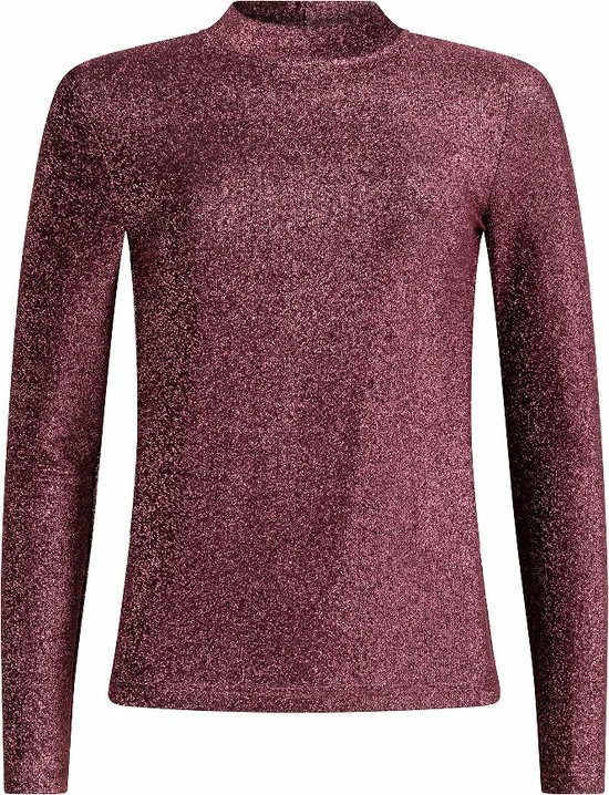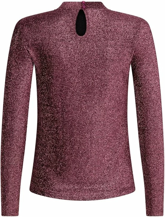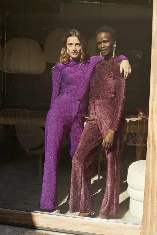 Top Evie is een vrouwelijke shiny metallic top die heerlijk acht aanvoelt. De top is all over met glitters. De top heeft een opstaand boordje en heeft 2 knoopjes . De top sluit mooi aan. Combineer de top met de bijpassende broek Joy. Top Evie is verkrijgbaar in de kleur paars.